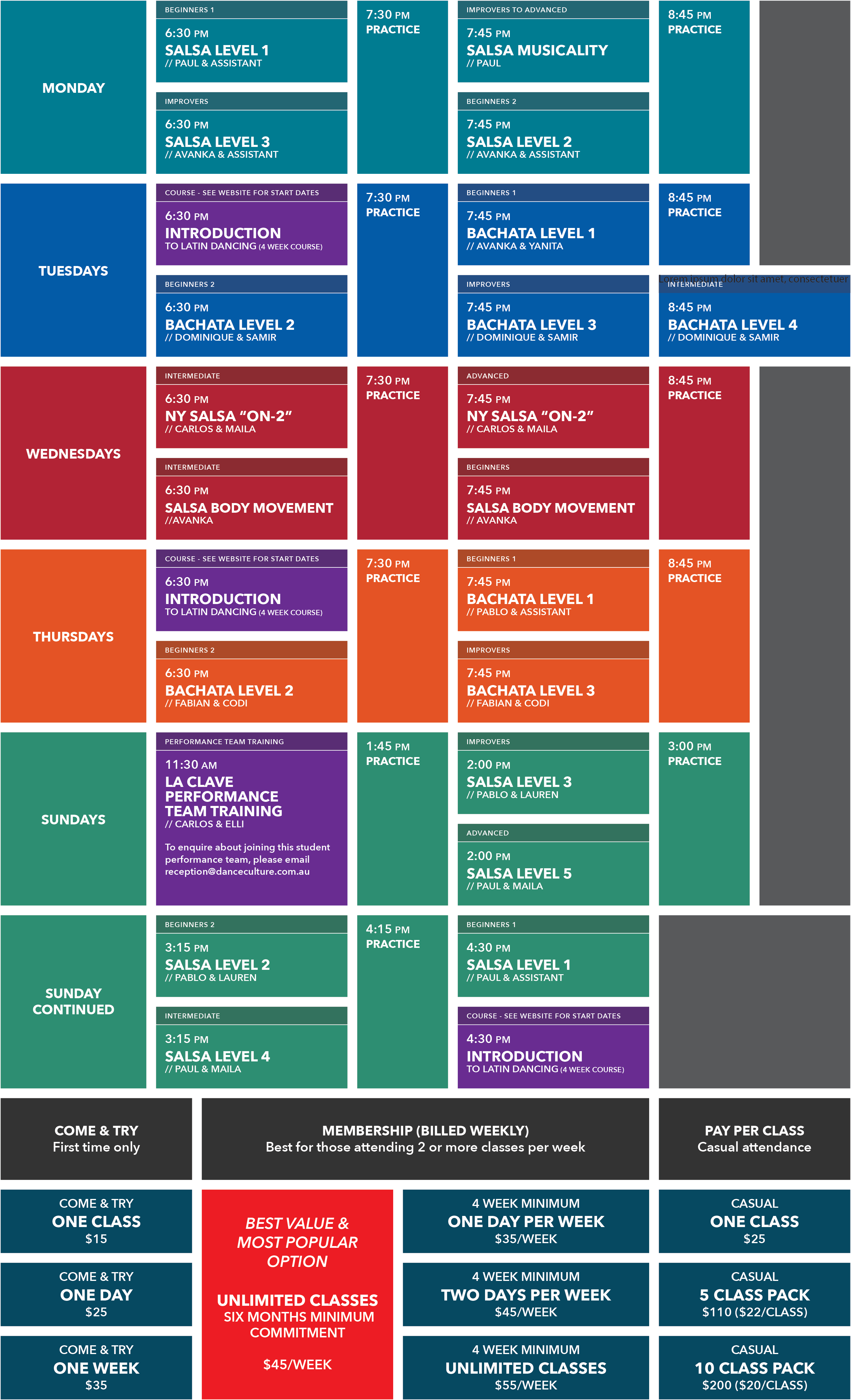 How much do classes cost? Please find the payment options at the bottom of the timetable. Please talk to us in person at the reception desk to organise payments (except for the Introduction to Latin Dancing course which requires online enrolment).